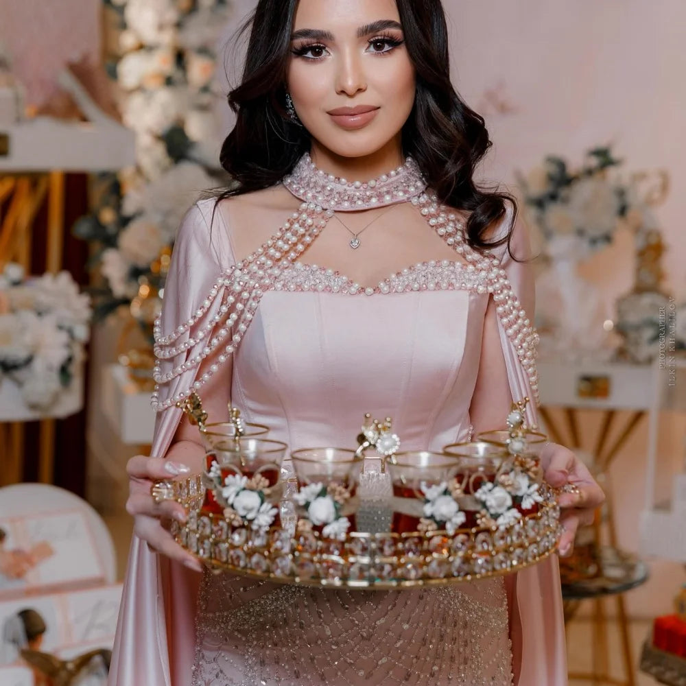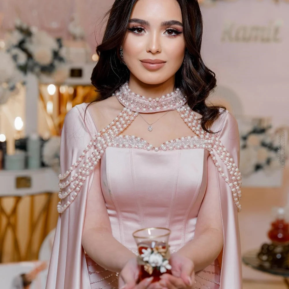 Champagne Beaded With a Shawl robes de soirée Strapless Satin Pearls Party Dresses Floor-Length Prom Dress 2025